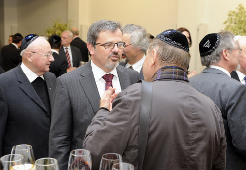 09.11.11 Nach 73 Jahren hat die traditionsreiche SCHUM-Stadt Speyer nach erfolgreich abgeschlossenem Umbau der ehemaligen katholischen Kirche St. Guido mit der heutigen festlichen Einweihung und Segnung der Synagoge „Beith-Schalom“ (Haus des Friedens) wieder eine Synagoge, nach Ende des Festaktes findet ein Empfang fuer die Ehrengaeste statt, OB Hansjoerg Eger im Gespraech mit Kuenstler Wolf Spitzer